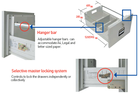 Çekmeceler çok sayıda dokümanı saklayacak kadar geniş ve derindir. Ek olarak dosyalarınız için de özel askı aparatı bulunmaktadır.